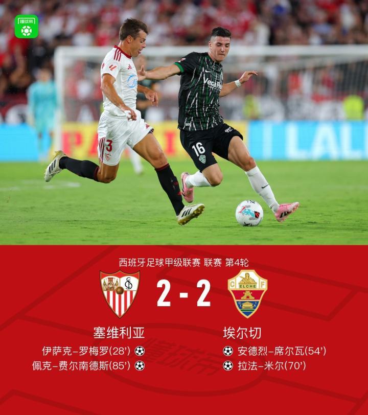 塞维利亚2-2埃尔切,罗梅罗破门+三次进球被吹,桑切斯献助攻