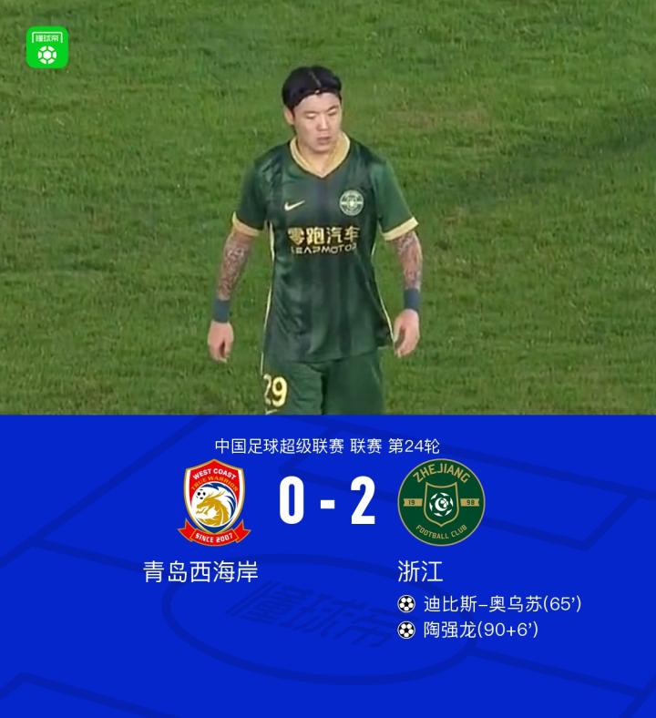 浙江客场2-0西海岸,奥乌苏、陶强龙破门,阿齐兹失良机
