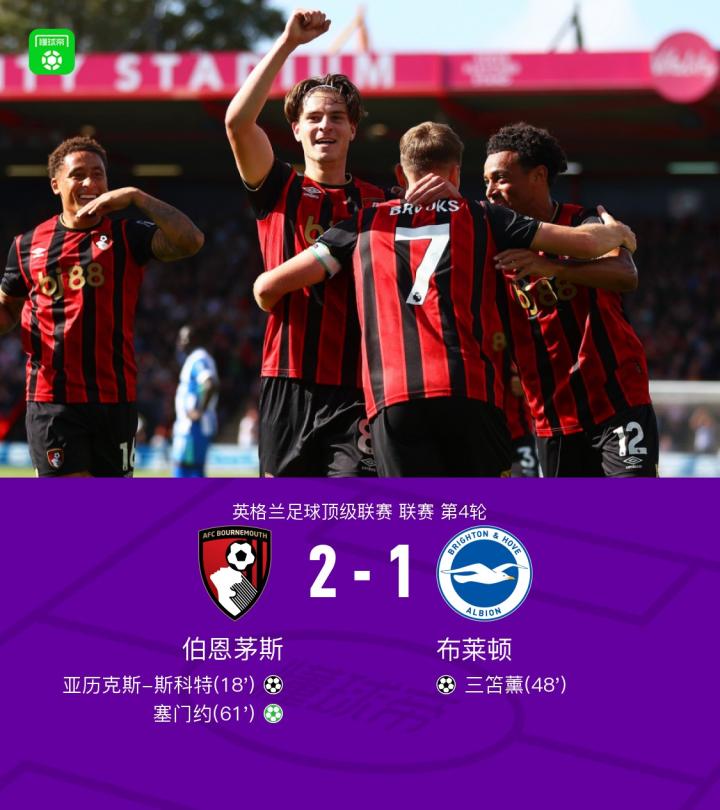 伯恩茅斯2-1布莱顿,塞门约传射,三笘薰头球破门难救主