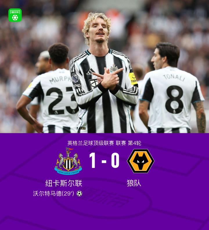 纽卡斯尔联1-0狼队获首胜,沃尔特马德首秀破门,托纳利中柱