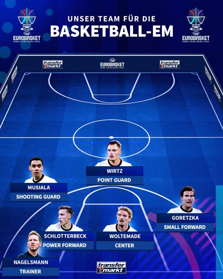 北京时间9月15日凌晨,男篮欧锦赛决赛即将在德国男篮和土耳其男篮之间打响。在本场比赛赛前,德国转会市场网站也在社媒“整活”排出了以德国男足组成的五人篮球首发,为欧锦赛决赛预热。