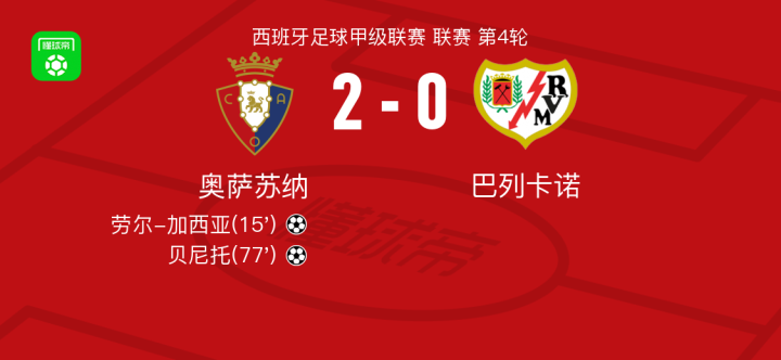 奥萨苏纳2-0巴列卡诺,劳尔-加西亚建功,贝尼托锁定胜局