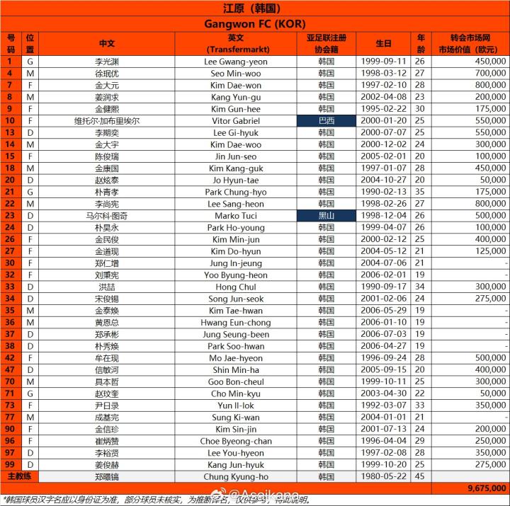 北京时间9月15日,德国转会市场亚洲区管理员朱艺@Asaikana 公布了江原(韩国)亚冠精英联赛(联赛阶段)的大名单。