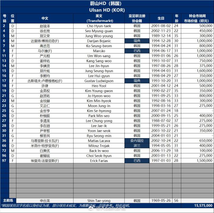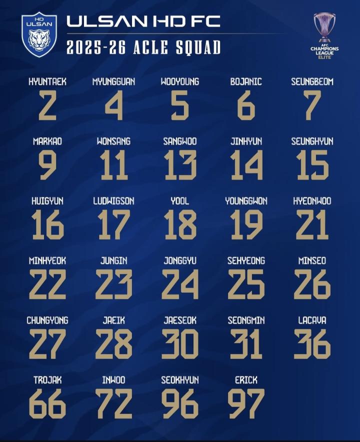 北京时间9月15日,德国转会市场亚洲区管理员朱艺@Asaikana 公布了蔚山HD(韩国)亚冠精英联赛(联赛阶段)的大名单。