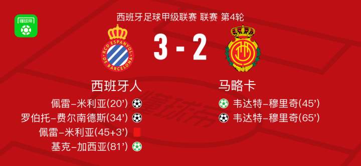 西班牙人3-2马略卡,基克-加西亚点射,罗伯托-费尔南德斯破门