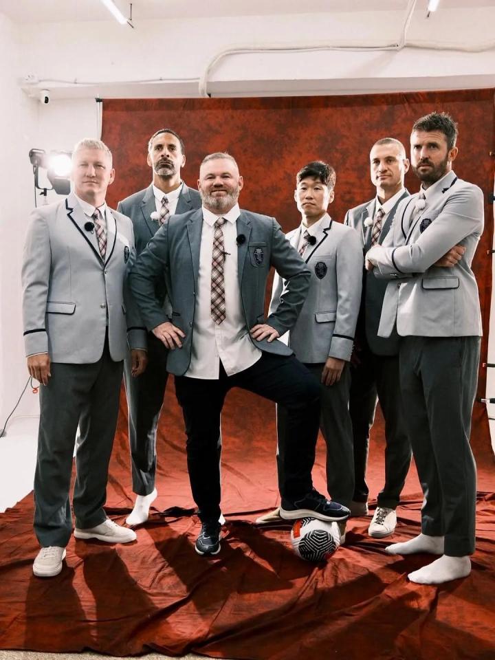 这位前英格兰后卫与施魏因施泰格、鲁尼、朴智星、维迪奇和卡里克一起站在阵容的后方,他们身穿灰色西装外套、深色裤子和带图案的领带。