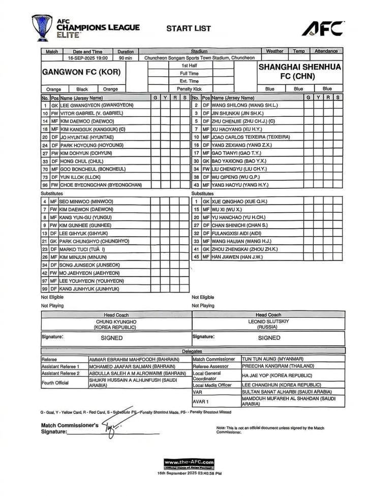 北京时间9月16日下午,亚冠精英联赛第一轮,上海申花将在客场对阵江原,赛前双方已经公布首发。