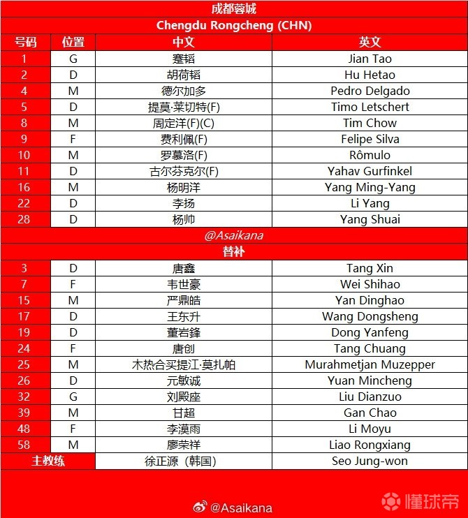 注:成都蓉城微调了替补名单,最终徐虹代替韦世豪进入替补名单。