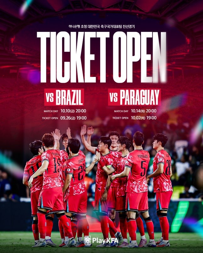 据悉,韩国vs巴西的门票将于9月25日晚开始预售,9月26日19:00(北京时间9月26日18:00)正式开售。