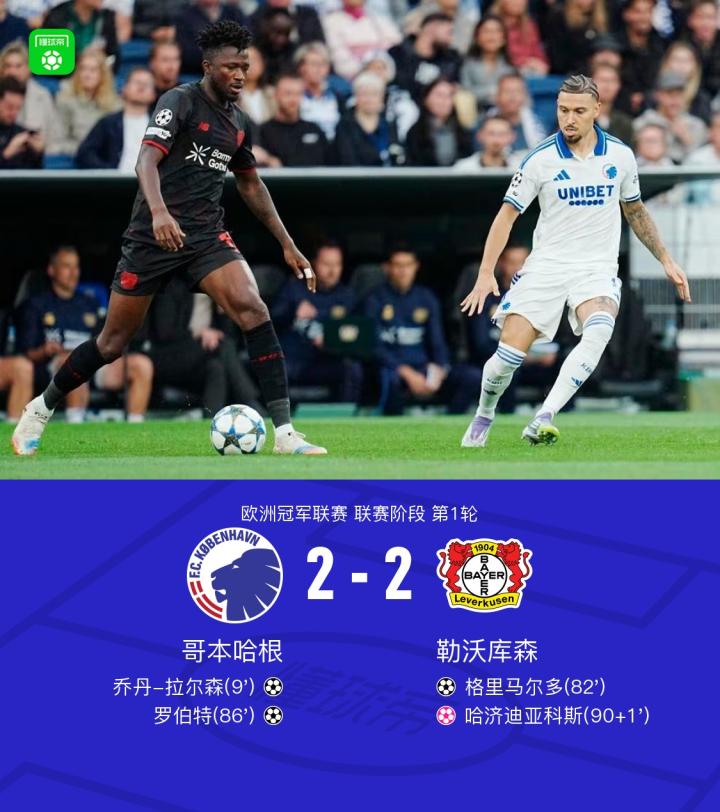 药厂2-2哥本哈根,格里马尔多任意球破门,哈济迪亚科斯补时乌龙