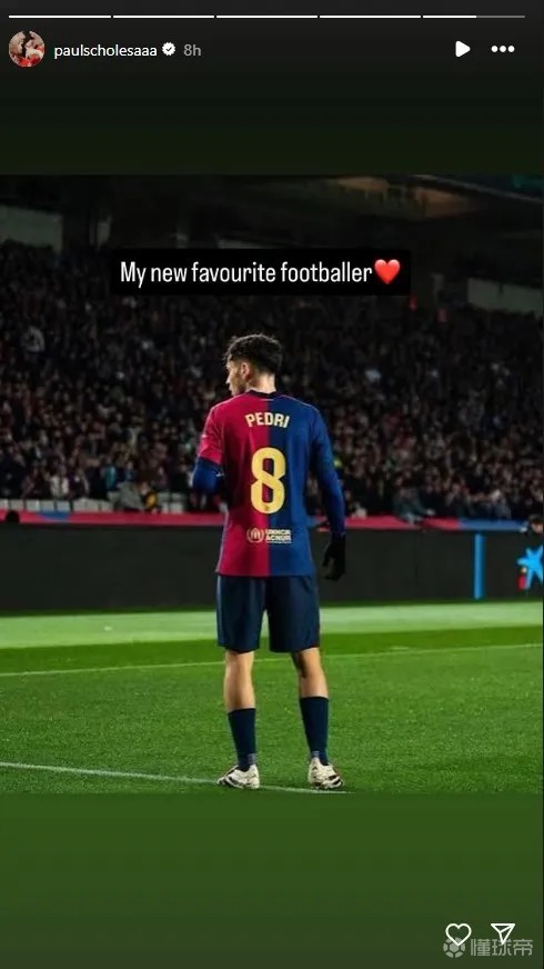 赛后,斯科尔斯在社媒晒出佩德里的照片,并配文:“我的新晋最爱球员”
