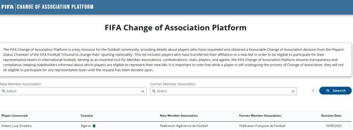 门将卢卡-齐达内已正式改变国家队会籍,从法国队转为阿尔及利亚队,未来将代表阿尔及利亚队出战。
