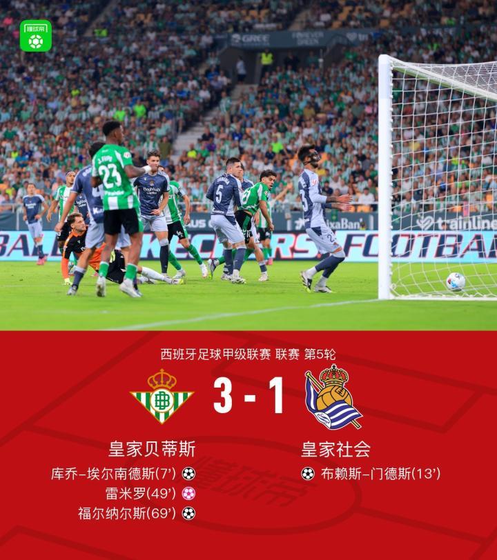 贝蒂斯3-1皇家社会,福尔纳尔斯破门,雷米罗乌龙