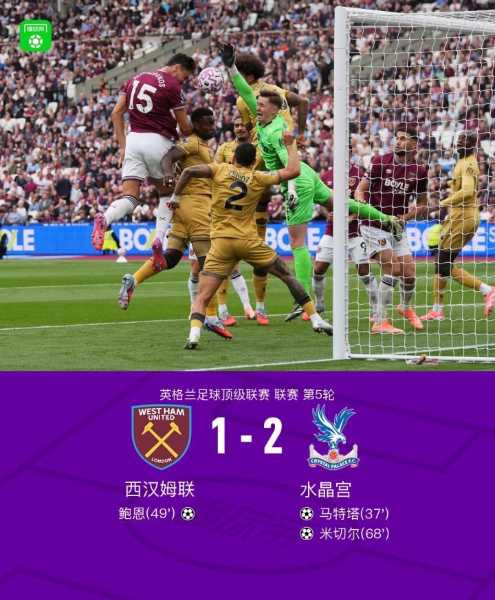 水晶宫2-1西汉姆联,马特塔、米切尔建功,鲍恩破门