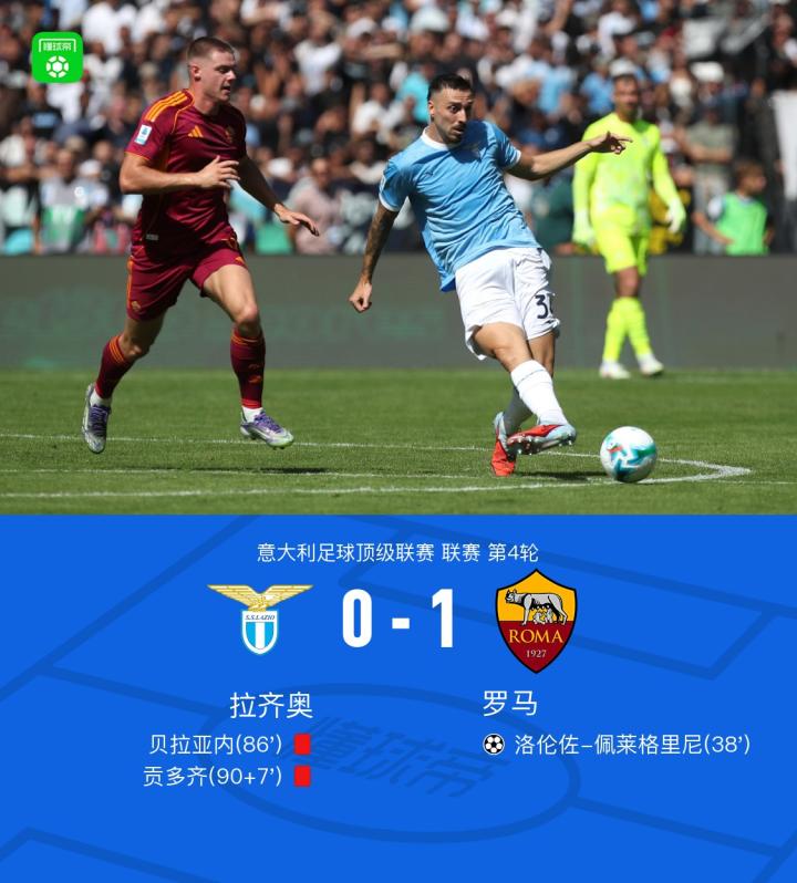 拉齐奥0-1罗马,佩莱格里尼破门,贝拉亚内染红,迪亚丢单刀