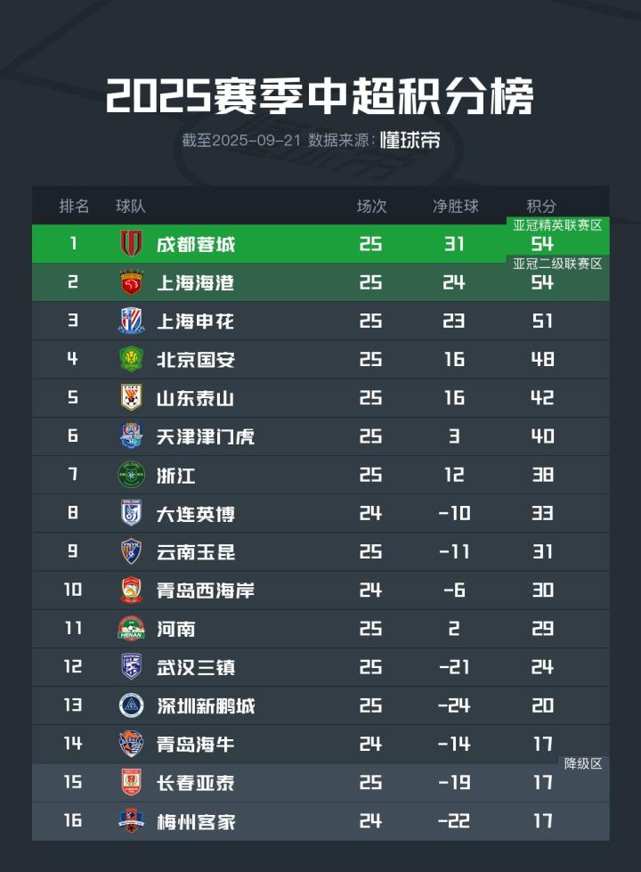 在争冠方面,成都蓉城和上海海港同积54分,分列积分榜第一、第二位,上海申花积51分位列第三,北京国安积48分排名第四。