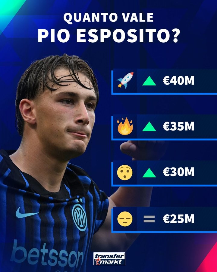 德转即将对意甲球员的身价进行更新,今日德转预热国米前锋皮奥-埃斯波西托的身价,球员最高可涨至4000万欧。