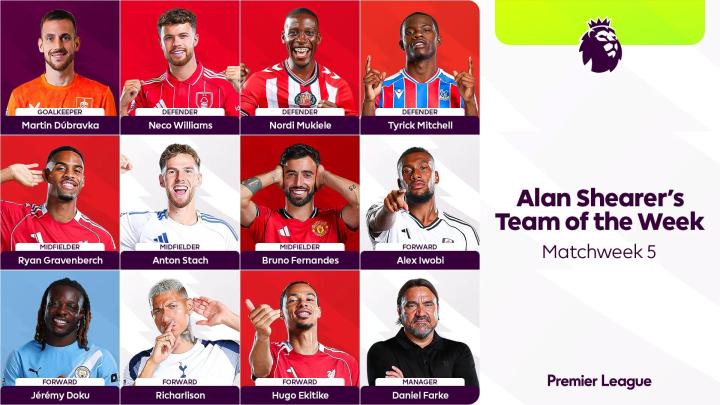 英超官方公布了阿兰-希勒评选的英超第5轮最佳阵容,埃基蒂克领衔,布鲁诺-费尔南德斯、赫拉芬贝赫、里沙利松、多库等人在列。