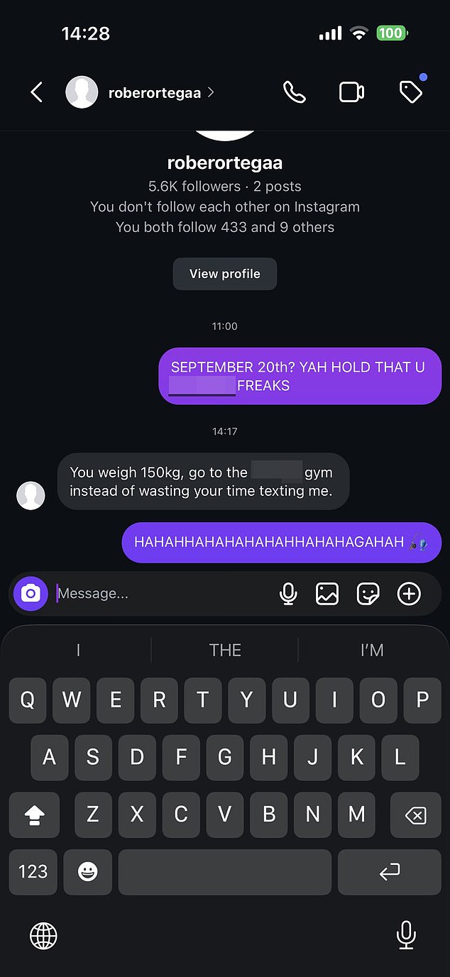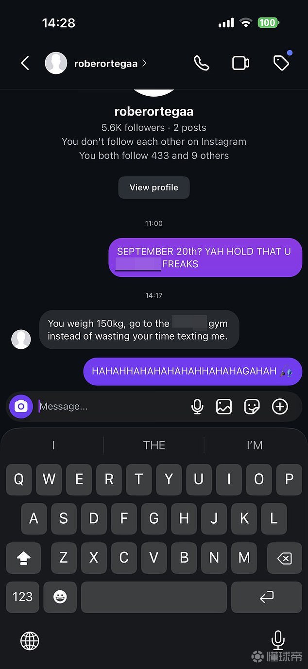 罗贝托回应说:“你体重150公斤,去健身吧,别浪费时间给我发消息。”