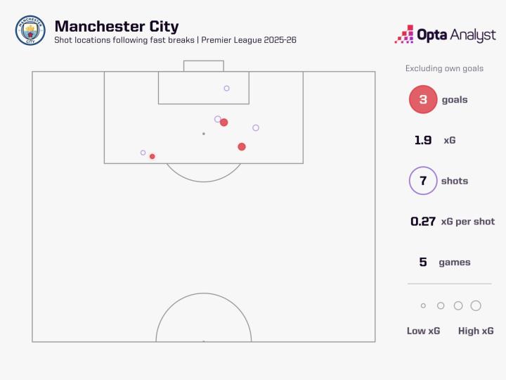 这也是曼城本赛季英超的第3个快速反击进球(定义为:在本方半场夺回球权后迅速由守转攻创造的射门机会),比任何一支球队都多。全英超只有曼联(8次)比曼城(7次)有更多快速反击射门。