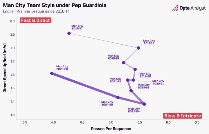 哈兰德在多特蒙德时就已经证明了自己在转换进攻中有多么高效,而本赛季曼城也充分利用了这一点。他们每一次进攻回合所用的传球次数比瓜迪奥拉执教以来的任何赛季都更少,下方图表显示了这一变化。