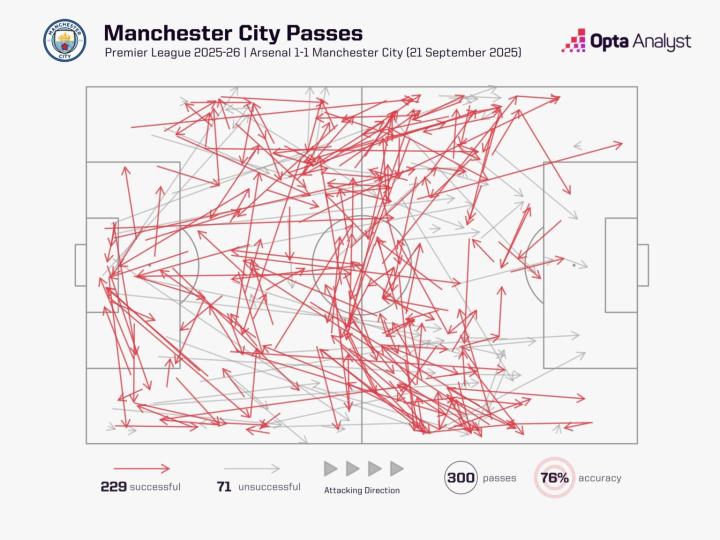全场比赛,曼城仅完成229次传球,这是瓜迪奥拉执教以来的第二低纪录。他们在后场出球上的尝试明显少于以往,这种改变或许也是为了保护新援门将多纳鲁马。