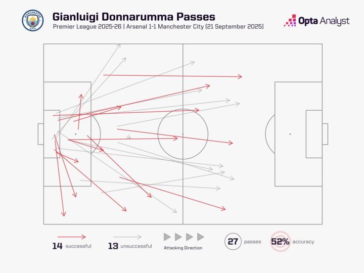 瓜迪奥拉在上周日的比赛中要求门将尽量选择大脚开球,多纳鲁马的传球成功率因此只有51.9%,但他触球时从未陷入丢球隐患——他明白自己一旦承受压力,随时可以选择大脚解围。
