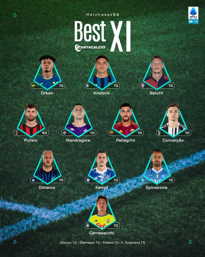 北京时间9月23日,意甲官方公布了联赛第4轮的最佳阵容,普利希奇、小孔塞桑、迪马尔科入选。