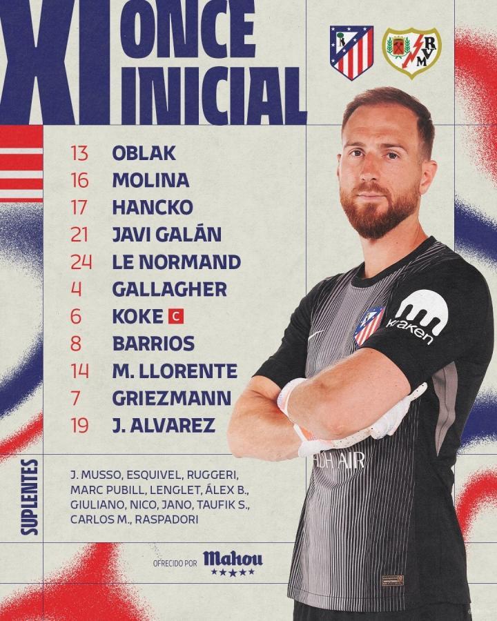 马德里竞技首发:13-奥布拉克、16-莫利纳、24-勒诺尔芒、17-汉茨科、21-哈维-加兰、14-马科斯-略伦特、6-科克、8-巴勃罗-巴里奥斯、4-加拉格尔、19-阿尔瓦雷斯、7-格列兹曼