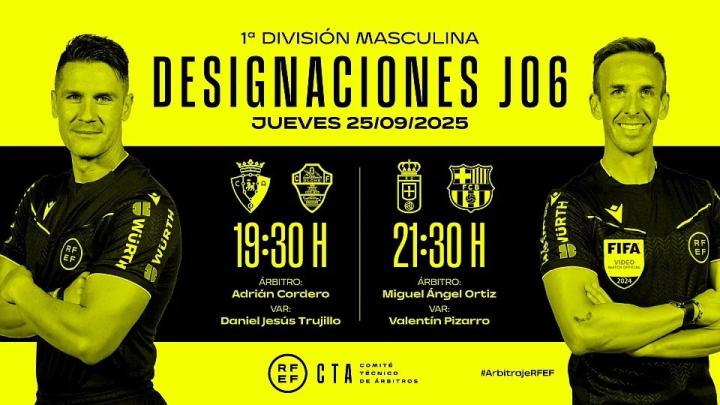 其中米格尔-奥尔蒂斯将执法皇家奥维耶多vs巴塞罗那,VAR为巴伦廷-皮萨罗。