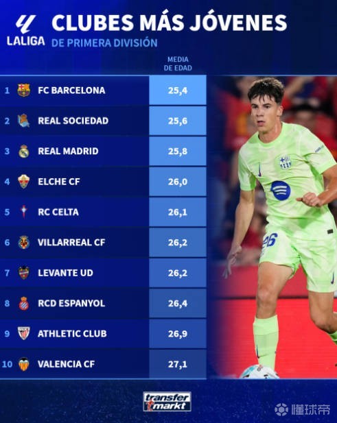 北京时间9月24日,德国转会市场列出了西甲球队平均年龄最低的球队前十名,其中巴萨以25.4岁居首,皇家社会以25.6岁位居第二,皇马以25.8岁位居第三,这三支球队是仅有的平均年龄低于26岁的球队。