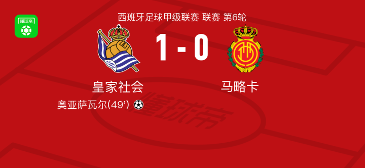 皇家社会1-0马略卡,奥亚萨瓦尔制胜