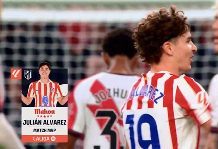 西甲第6轮,马德里竞技主场3-2击败巴列卡诺,此役上演帽子戏法的阿尔瓦雷斯当选西甲官方全场最佳球员。