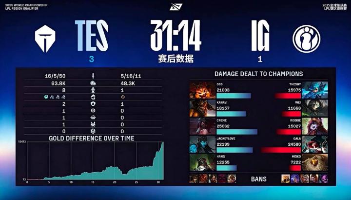 北京时间9月25日,LPL冒泡赛胜者组,TES迎战iG。本局TES前期就取得了优势,中期虽然iG打回一波,但还是无力回天。TES最终3-1战胜iG,成为LPL赛区的三号种子。