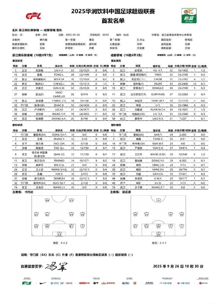 北京时间9月26日20:00,中超联赛第26轮继续进行,争冠球队成都蓉城客场挑战浙江队,赛前双方首发阵容公布如下: