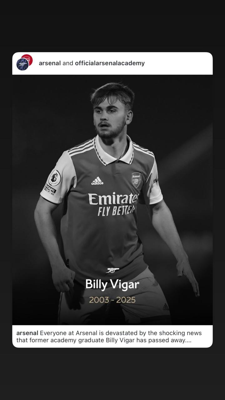 【阿森纳官方悼念前青训球员比利-维加:深感悲痛,致以最深切的哀悼】