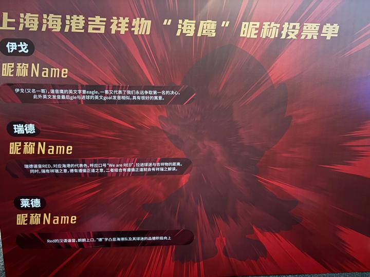 据上海海港主场的投票单显示,上海海港吉祥物“海鹰”的昵称最终三强候选:伊戈、瑞德、莱德。