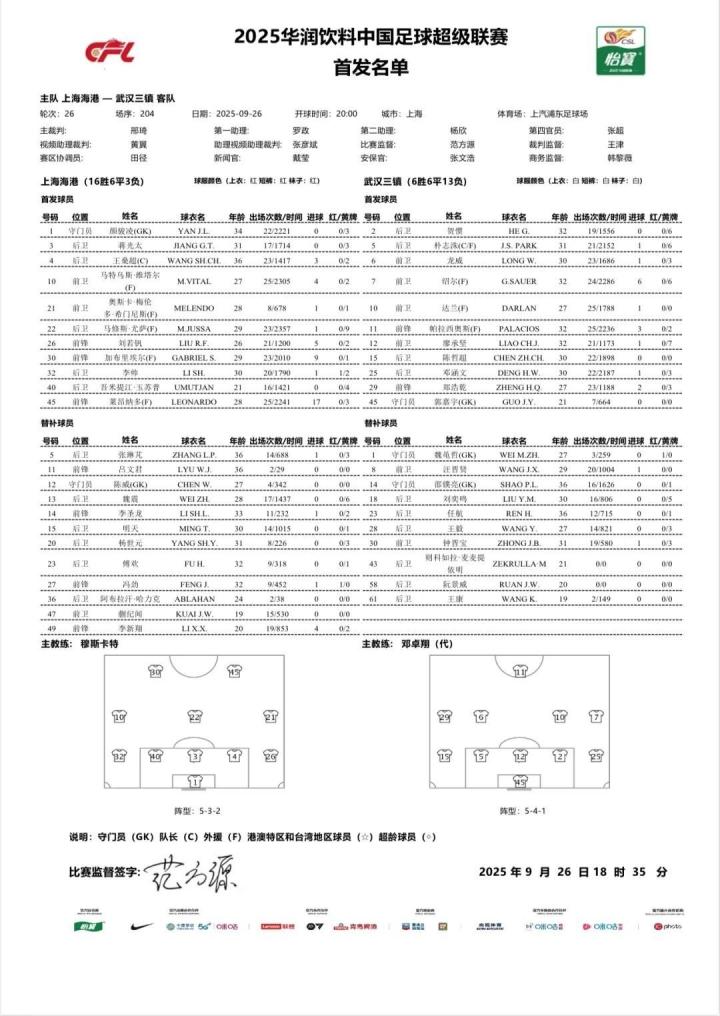 北京时间9月26日20:00,中超第26轮的一场较量。上海海港坐镇主场,迎战武汉三镇。赛前,双方的阵容公布如下: