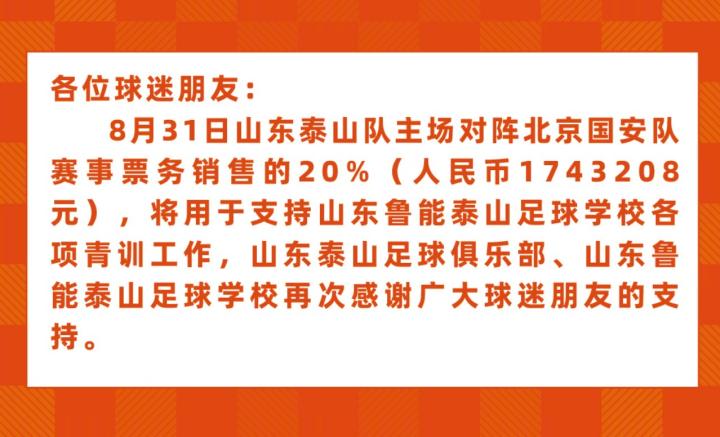 “各位球迷朋友:8月31日山东泰山队主场对阵北京国安队赛事票务销售的20%(人民币1743208元),将用于支持山东鲁能泰山足球学校各项青训工作,山东泰山足球俱乐部、山东鲁能泰山足球学校再次感谢广大球迷朋友的支持。”