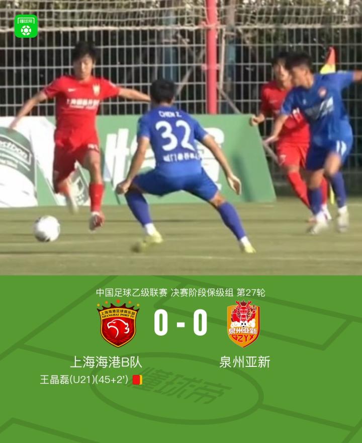 十人海港B队0-0泉州亚新,双方秋色平分,王晶磊染红
