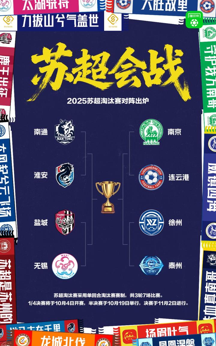 根据规则,苏超淘汰赛阶段的对阵也随之出炉。