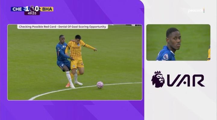 裁判现场宣布:“经过复核,切尔西23号球员有明显犯规。因此,他破坏了一次明显的得分机会,判罚结果是红牌加任意球。最终决定是向切尔西23号球员出示红牌。”