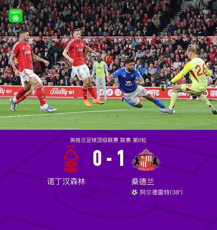 诺丁汉森林0-1桑德兰,扎卡助攻阿尔德雷特头槌制胜