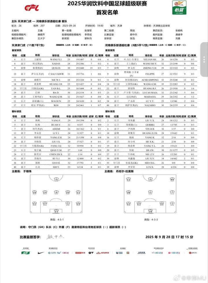 北京时间9月28日19点中超第26轮,天津津门虎迎战河南,赛前双方首发阵容公布。