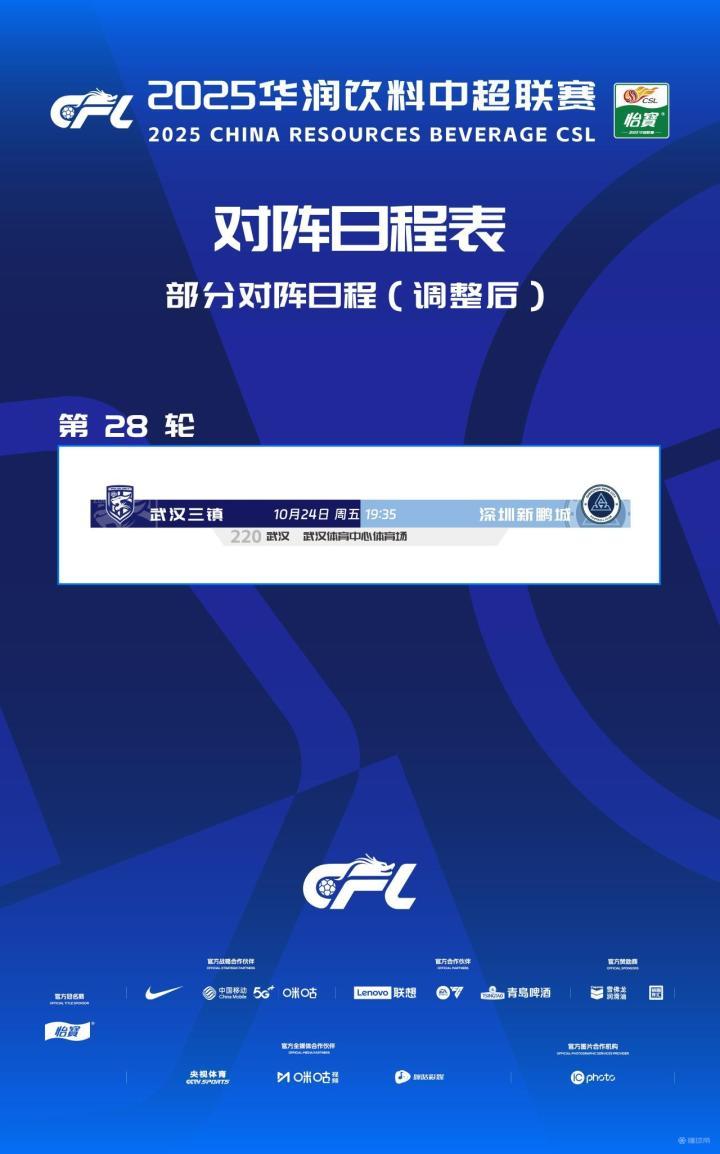 9月28日,中国足球职业联赛联合会发布公告调整部分赛程,中超第28轮武汉三镇主场对深圳新鹏城比赛提前到10月24日19:35开打,原先开球时间为10月25日19:35。