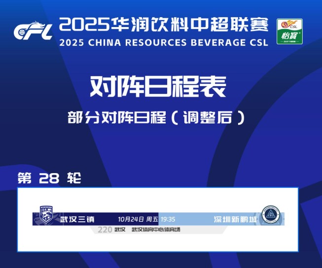 根据2025华润饮料中超联赛赛程,武汉三镇对阵深圳新鹏城比赛将于10月25日19:35在武汉体育中心体育场进行,因武汉体育中心大型活动,为保证本场比赛安全有序进行。经武汉赛区申请,协商武汉三镇足球俱乐部、深圳新鹏城足球俱乐部以及有关方面同意,现决定将武汉三镇对阵深圳新鹏城比赛进行调整,具体调整如下: