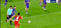 第4分钟,萨尔瓦多挑球过人后蹬到阿奇姆彭脚踝,后者痛苦倒地