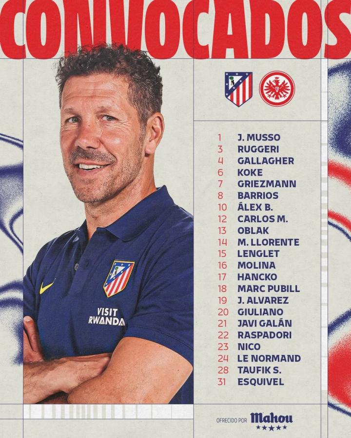 马德里竞技官方公布了欧冠主场对阵法兰克福的比赛大名单,格列兹曼领衔,阿尔瓦雷斯在列,瑟洛特、阿尔马达缺席。