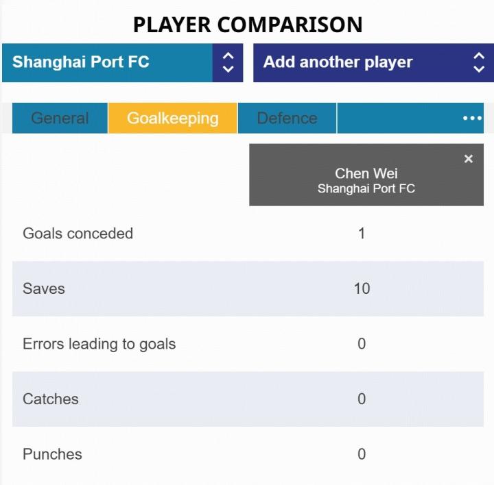 本场比赛,海港门将陈威表现亮眼。他全场贡献10记扑救,包括7记禁区射门的扑救,出击2次成功1次。