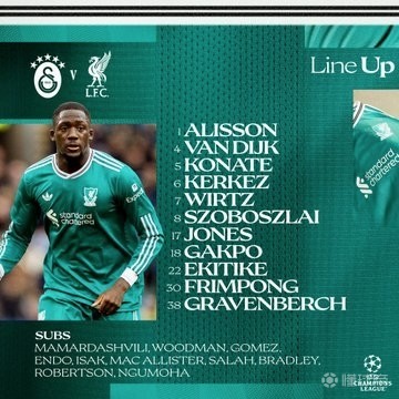 利物浦首发:1-阿利松、4-范戴克、5-科纳特、6-科尔克兹、7-维尔茨、8-索博斯洛伊、17-柯蒂斯-琼斯、18-加克波、22-埃基蒂克、30-弗林蓬、38-赫拉芬贝赫